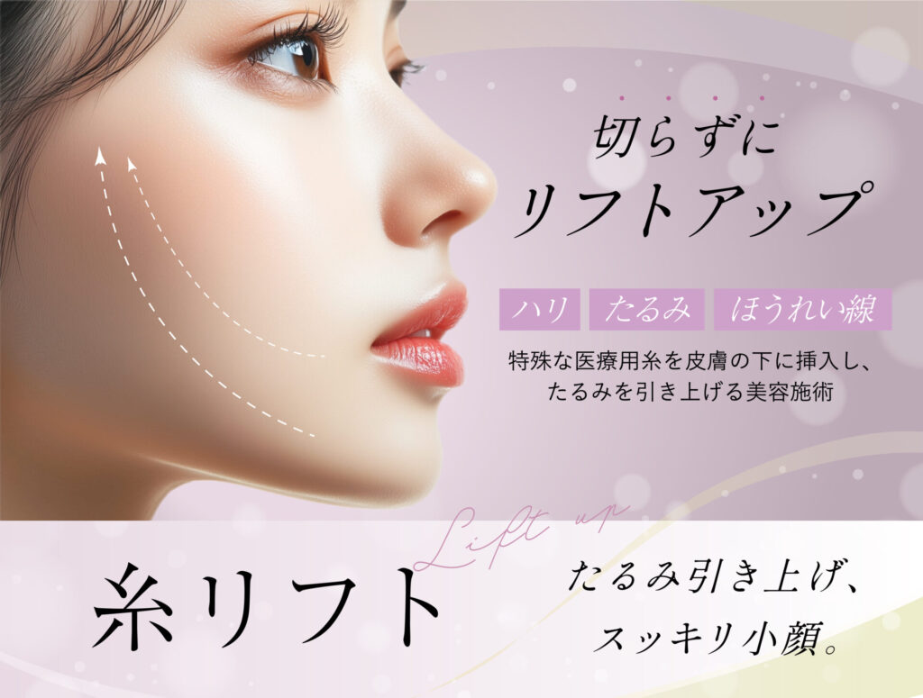 KIA式糸リフト施術(スレッドリフト)は、特殊な医療用糸を皮膚の下に挿入し、たるみを引き上げる美容施術です。